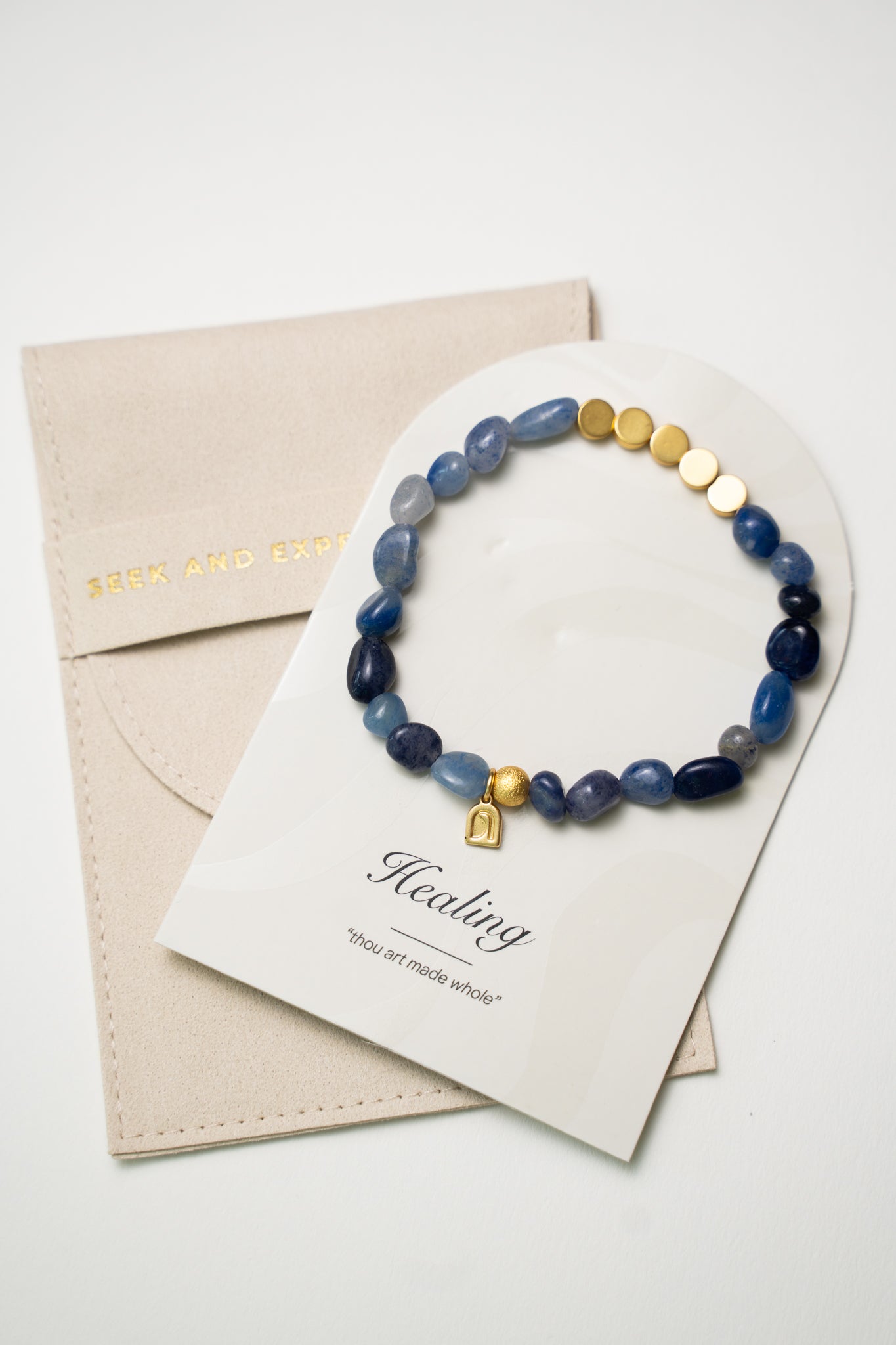 Inspired by the miracle that took place at the pools of Bethesda (described in John 5:2-15), the water-colored aventurine beads in this bracelet represent the pools, and the five gold beads symbolize the five porches of Bethesda. Five is also the number meaning “grace” in Hebrew, and Bethesda can be translated to “the house of grace.” In His timing and through His grace, you will be made whole again. Wear this bracelet as a reminder that He is a God of healing.
