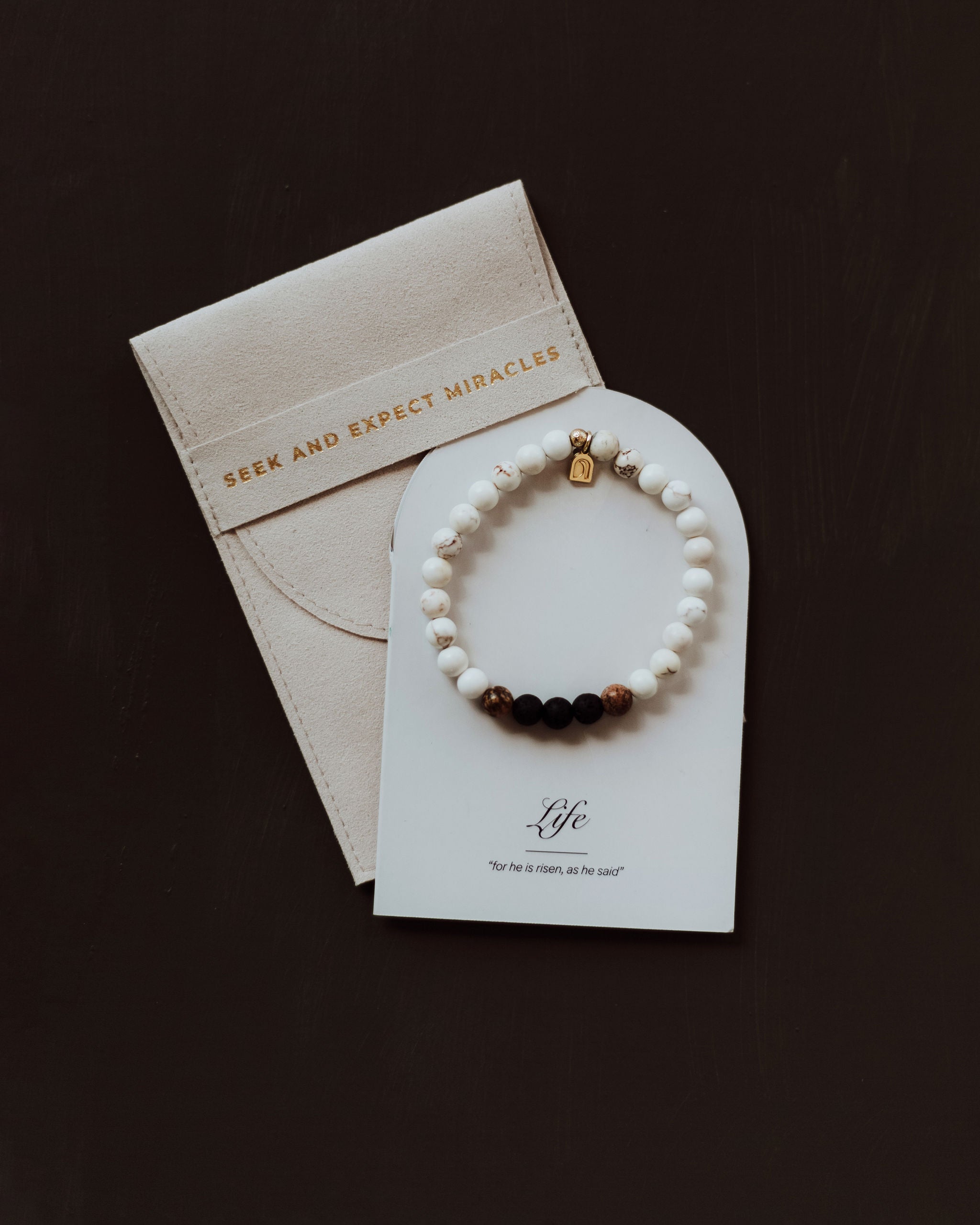 Inspired by the miracle that is the Resurrection of Jesus Christ (described in Matthew 28:5-7), the three lava-stone beads in this bracelet symbolize the three days that Jesus spent in the tomb. The two brown beads on either side represent the tomb, and the white turquoise beads symbolize life. Death is a part of everyone's story, but because of Him, so is life. Wear this bracelet as a reminder that He is a God of life.