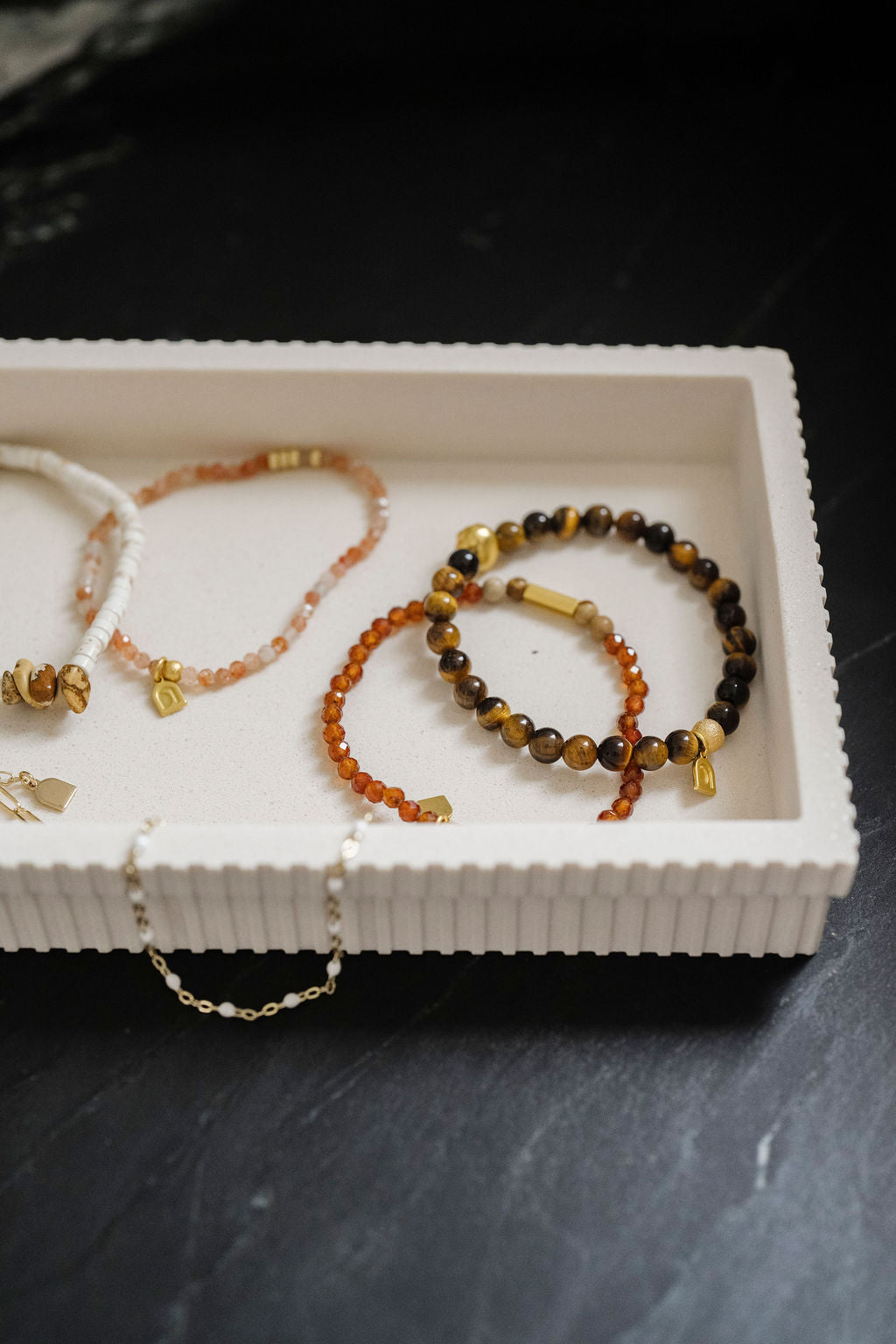 Inspired by the miracle of the parting of the Red Sea (described in Exodus 14:1–22, 15:11), the red gemstone beads in this bracelet represent the Red Sea and are divided by a gold staff and beads that represent the dry ground. The same God who parted the waters is still making a way. Wear this bracelet as a reminder that He will deliver you.