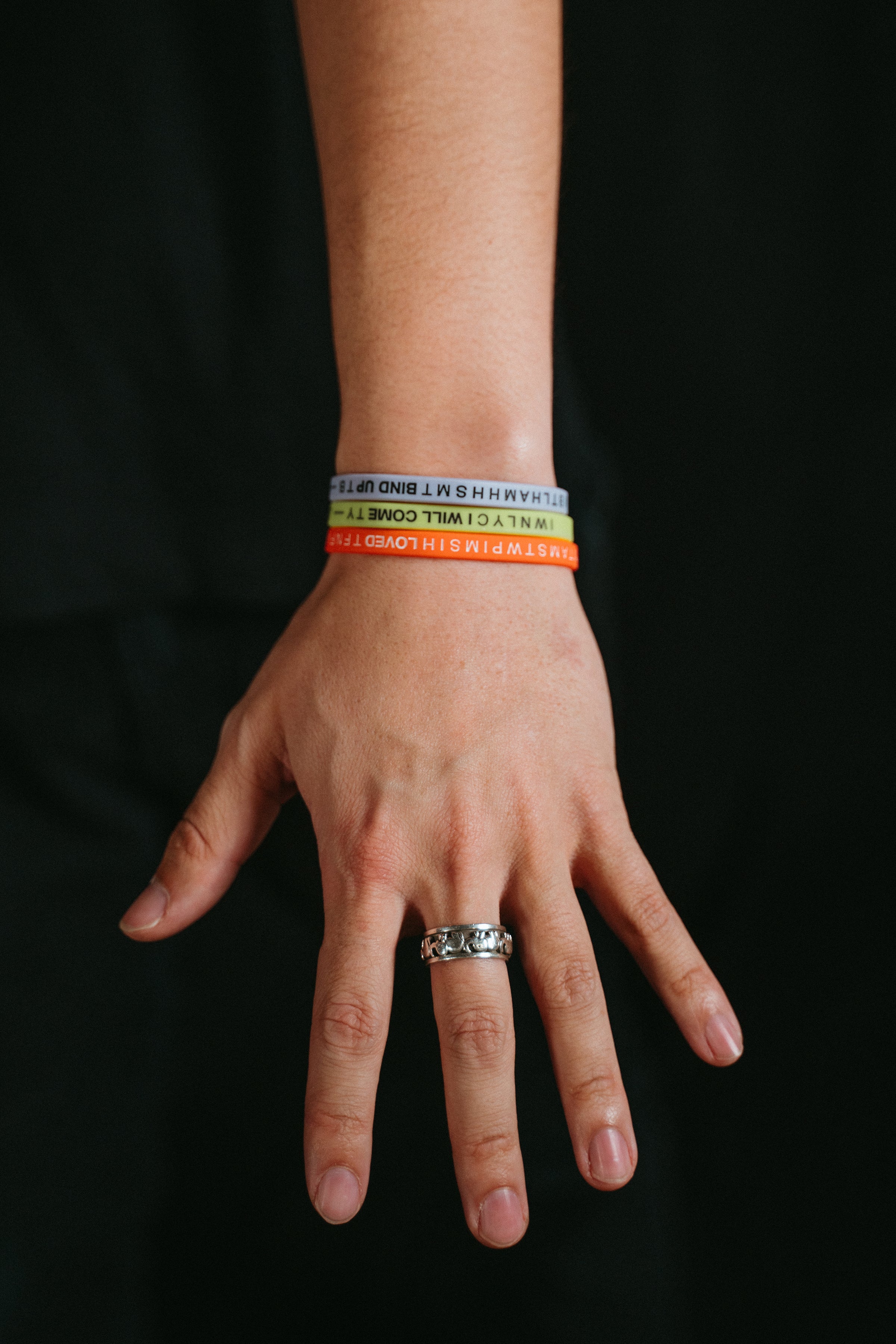 The letters on the silicone bracelets are the first letters of each word of the verse they come from. It can be both a reminder of what it teaches and a way to memorize them—locking the words up in your heart.
